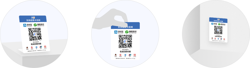 收款码台卡可放置于收银台,也可拿到顾客面前完成收款,收款码贴纸可张贴于店铺各处收款